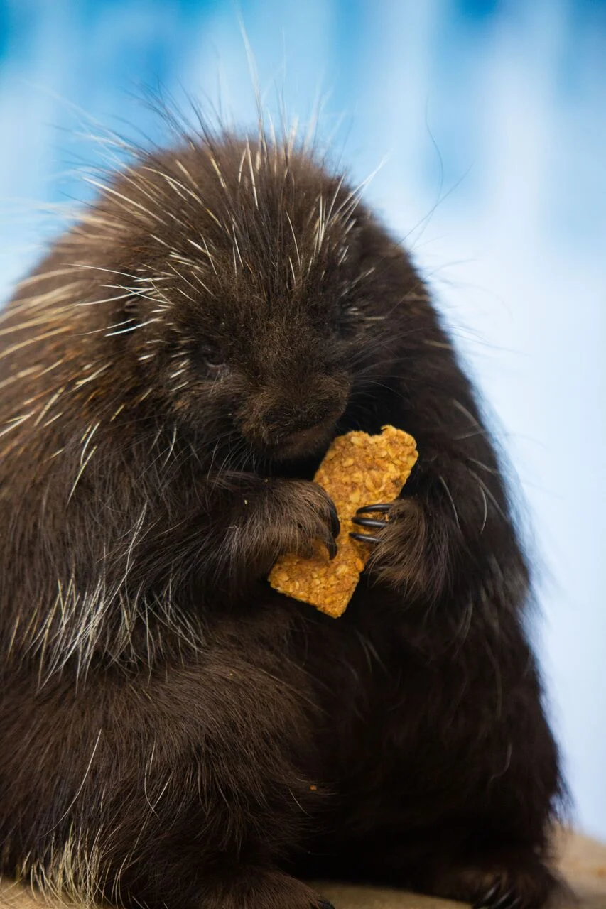 Did you know porcupines are covered in over 30,000 quills? Or that each one is equipped with barbs that expand once it hits the skin? Luckily, Phyllis Quiller is used to people and was content munching on her granola bar!